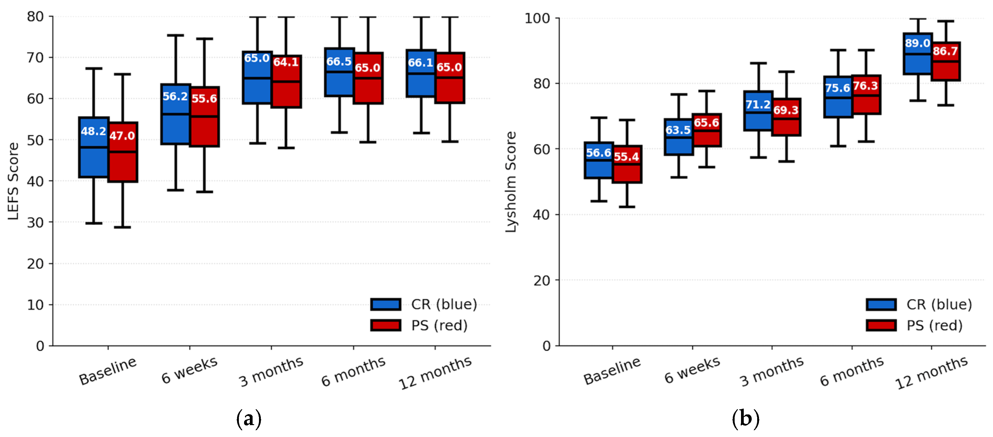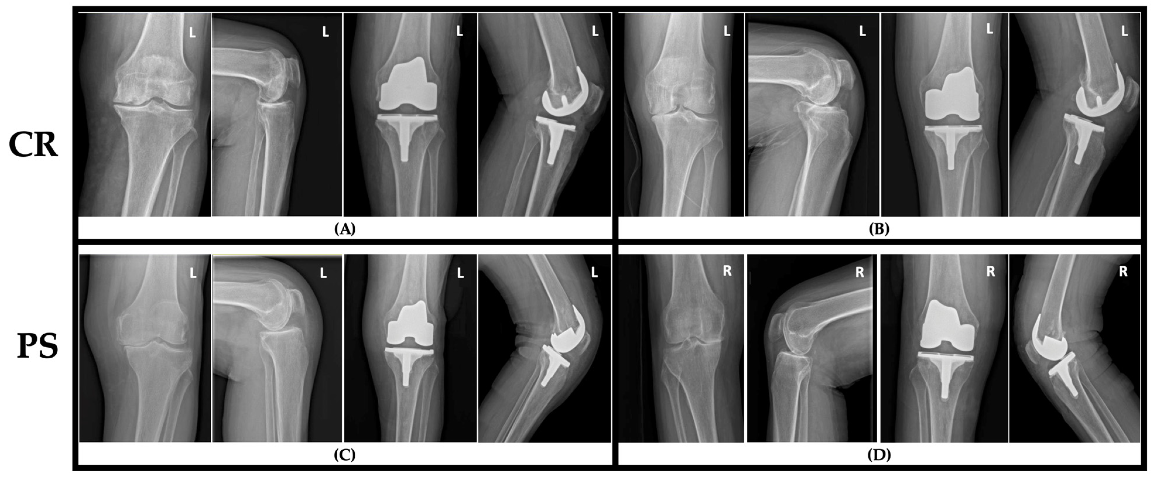- García-Estrada, E.I.; Ramírez-Yañez, E.; Álvarez-Alarcón, G.; Muñoz-Nieto, D.; Villaseñor-Valdés, J.J.; Núñez-García, L.A. Comparative Outcomes Between Cruciate-Retaining and Posterior-Stabilized Prostheses in Total Knee Arthroplasty. Cureus 2025, 17, e87465. [Google Scholar] [CrossRef]