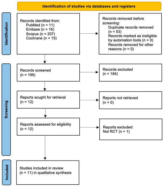 The database search yielded 249 records, including 11 from PubMed, 16 from Embase, 207 from Scopus, and 15 from the Cochrane Library. After removing 53 duplicates, 196 records remained for screening. Title and abstract screening resulted in the exclusion of 184 records, leaving 12 reports for retrieval. All 12 reports were successfully retrieved and assessed for eligibility. One report was excluded for not being a randomized controlled trial, resulting in 11 studies being included in the qualitative synthesis. This is shown in Figure 1.