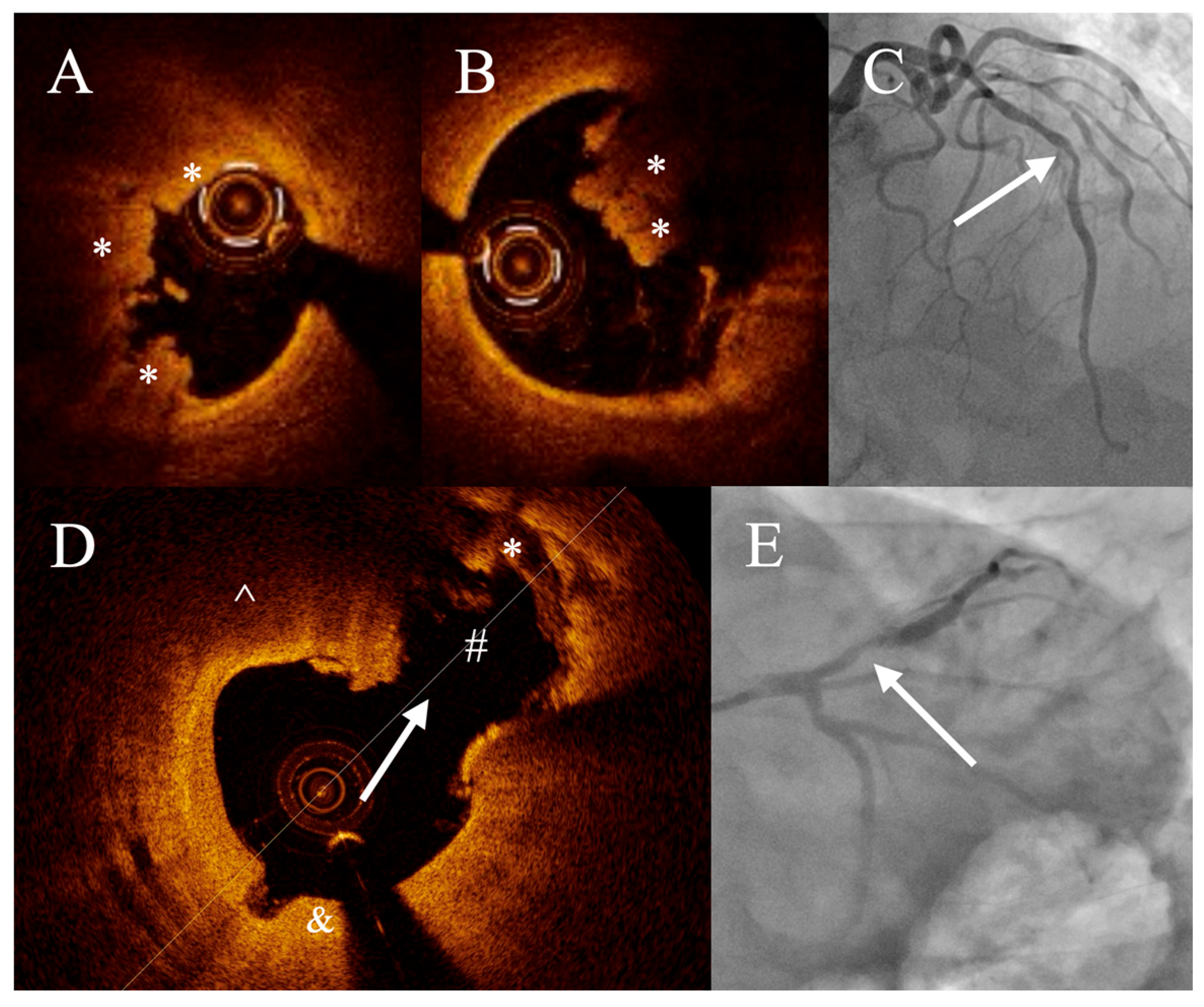 - Jia, H.; Dai, J.; Hou, J.; Xing, L.; Ma, L.; Liu, H.; Xu, M.; Yao, Y.; Hu, S.; Yamamoto, E.; et al. Effective Anti-Thrombotic Therapy without Stenting: Intravascular Optical Coherence Tomography-Based Management in Plaque Erosion (the EROSION Study). Eur. Heart J. 2017, 38, 792–800. [Google Scholar] [CrossRef]