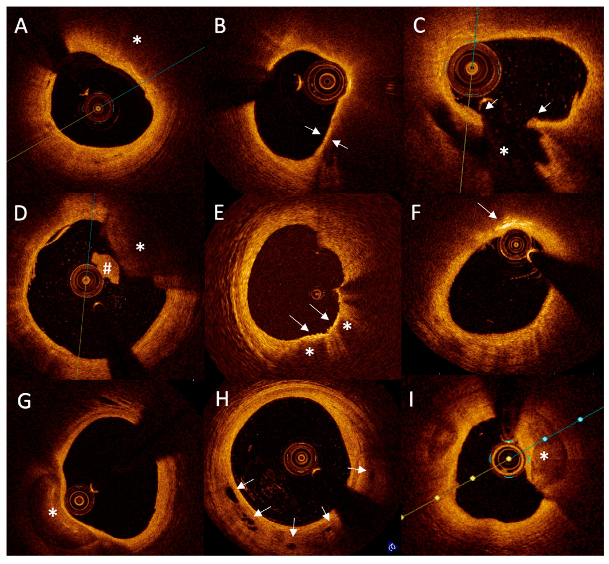 - Kato, K.; Yonetsu, T.; Kim, S.-J.; Xing, L.; Lee, H.; McNulty, I.; Yeh, R.W.; Sakhuja, R.; Zhang, S.; Uemura, S.; et al. Nonculprit Plaques in Patients with Acute Coronary Syndromes Have More Vulnerable Features Compared with Those with Non-Acute Coronary Syndromes: A 3-Vessel Optical Coherence Tomography Study. Circ. Cardiovasc. Imaging 2012, 5, 433–440. [Google Scholar] [CrossRef]