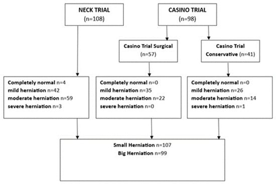 A total of 206 patients were eligible for inclusion, of whom 98 were from the CASINO Trial, and 108 were from the NECK Trial. In both the NECK and the CASINO trial, the number of patients demonstrating slight bulging was very limited (Figure 2). Likewise, the number of patients demonstrating a severe size of herniation was very small. Therefore, the data were dichotomised by combining ‘slight bulging’ and ‘small herniated disc’ into small disc herniation (n = 107) and combining ‘moderate herniated disc’ and ‘severe herniated disc’ into ‘large disc herniation’ (n = 99). This dichotomisation was chosen to ensure sufficient sample sizes in each group for meaningful statistical analysis.