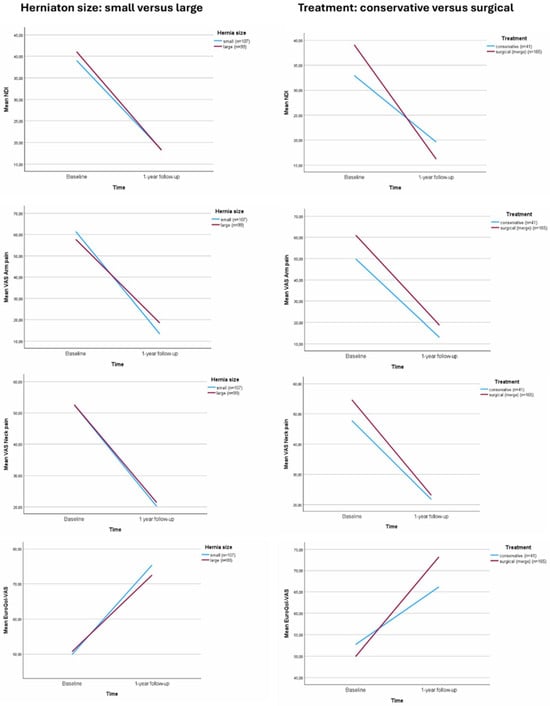 At baseline, the mean NDI score in the surgically treated patients was 39.1 ± 15 compared to 39.0 ± 16 in the conservatively treated patients (p = 0.929), which decreased to 16.2 ± 15 and 19.6 ± 22 after one year of follow-up (p = 0.361) (Table 2, Figure 3). The mean VAS arm pain scores were 61.1 ± 23 in the surgical arm during enrolment and 49.8 ± 28 in the conservative arm (p = 0.009). After one year, the mean VAS arm pain improved to 18.7 ± 25 in the surgical arm and 13.0 ± 22 in the conservative arm (p = 0.197). At baseline, the mean VAS neck pain was 54.6 ± 26 in the surgical treatment group versus 47.8 ± 29 in the conservative treatment group (p = 0.119). One year after inclusion, this was 23.1 ± 25 versus 21.7 ± 28 (p = 0.778). The mean EQ-VAS increased within both treatment groups: from 49.9 ± 23 versus 52.7 ± 23 at baseline (p = 0.438), to 73.2 ± 21 versus 66.2 ± 28 after one year (p = 0.139) (Table 2, Figure 3). Linear regression models did not show any significant differences between clinical outcomes at baseline nor after one year in the large versus small herniation size groups (Appendix B).