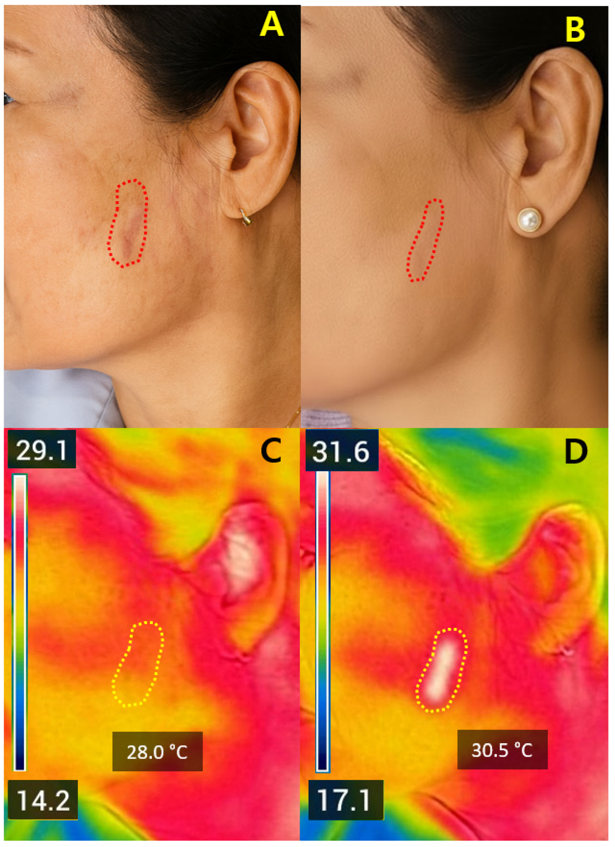 Therefore, in this study, we aimed to quantify skin-surface temperature changes during Er:Glass non-ablative fractional laser treatment using real-time FLIR thermography and to correlate these thermal dynamics with early clinical outcomes. By exploring whether a clinically meaningful “thermal window” may be identified as an indicator of safe and effective treatment response, we sought to provide preliminary, evidence-based insight into temperature-guided non-ablative fractional laser therapy in scar management.