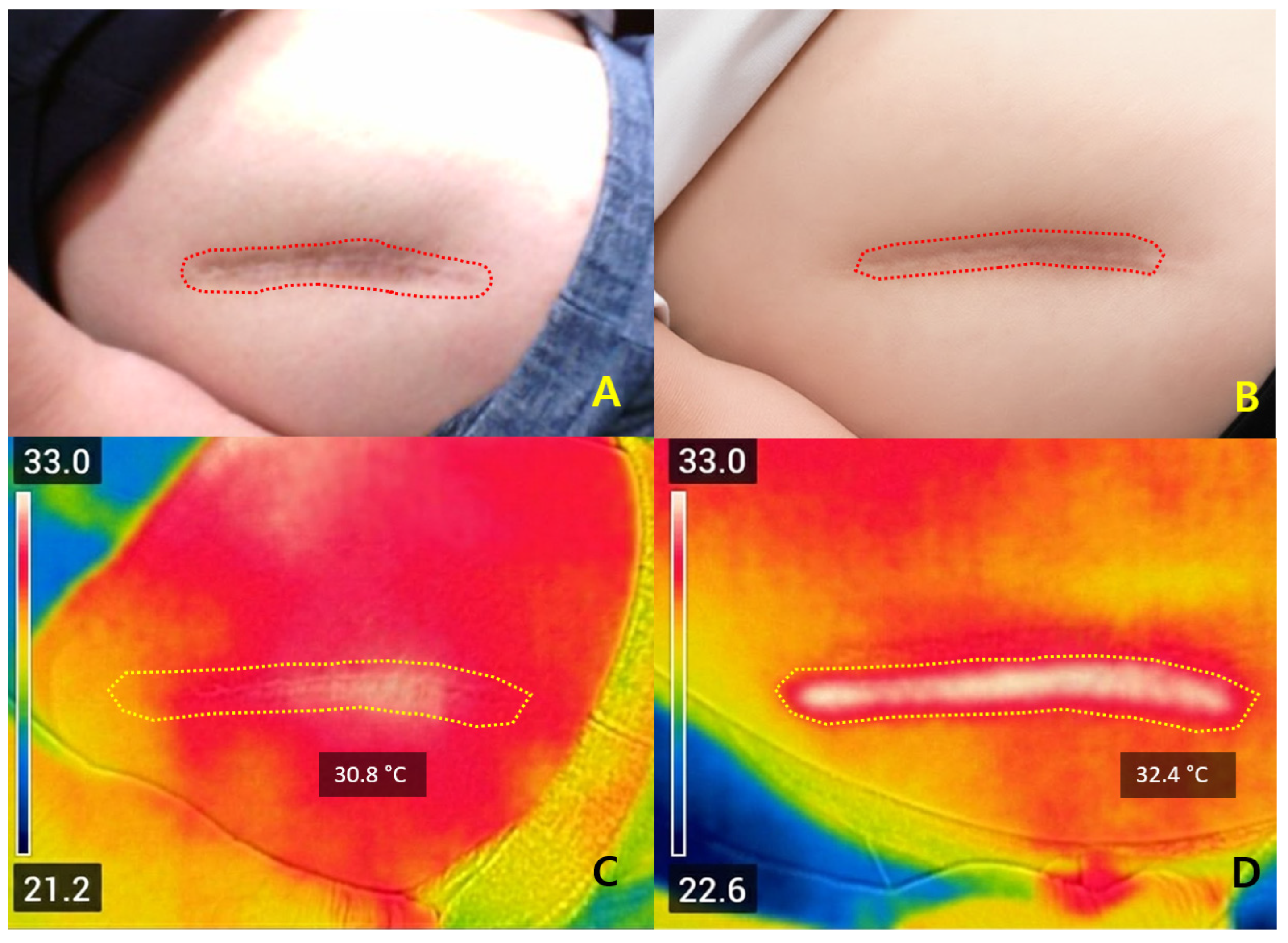 19], but expand upon them by incorporating FLIR thermography to characterize thermal dynamics and provide physiological context for heating-induced remodeling. Recent clinical studies have also reported favorable outcomes of 1550 nm Er:Glass fractional photothermolysis for improving scar characteristics and dermal texture, particularly in atrophic and treatment-resistant lesions [