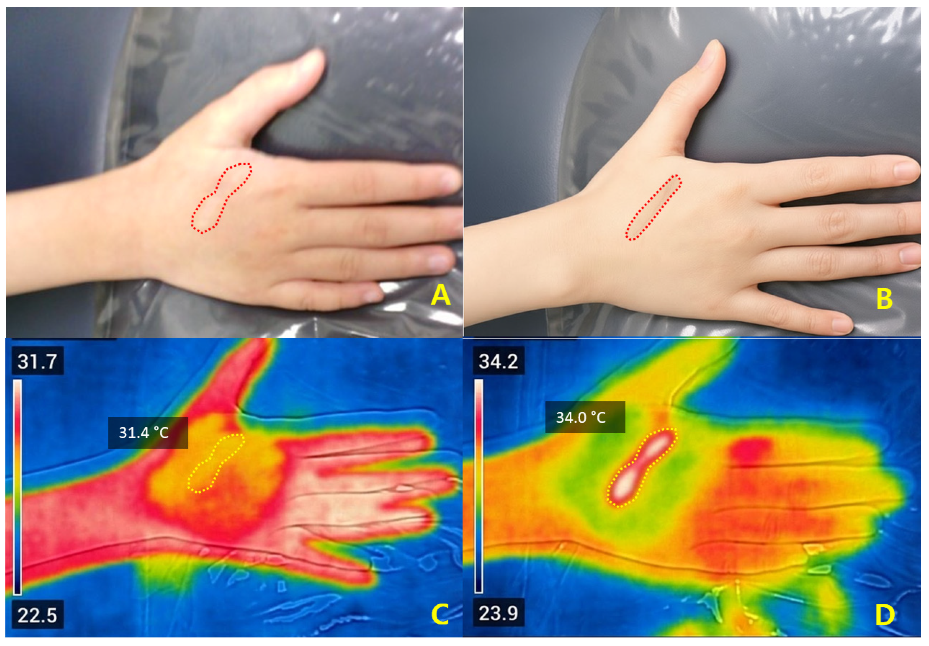 2 cannot be determined from the present dataset. FLIR thermography measures surface temperature and does not directly reflect subsurface heating; however, prior optical modeling suggests a potential relationship between surface and dermal thermal behavior. As FLIR measures only surface temperature, the correspondence between ΔT