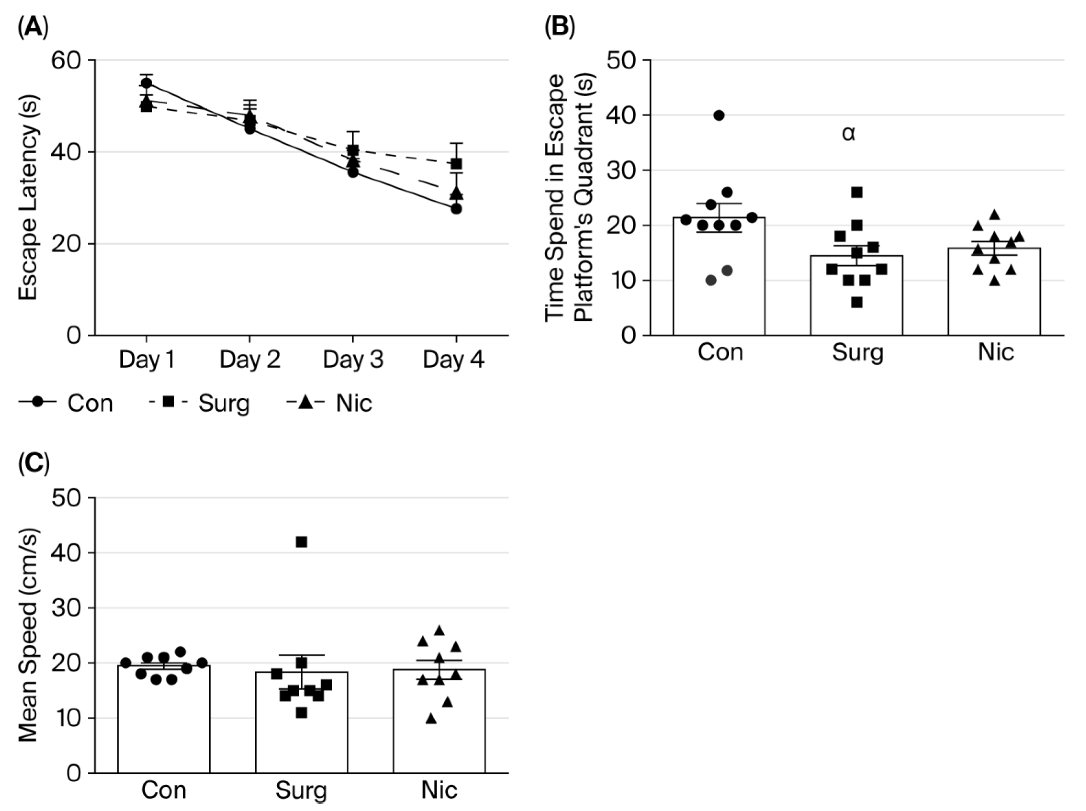 3.1. Effects of Nicardipine on MWM Test Outcomes