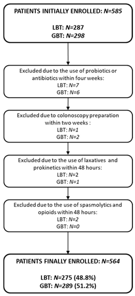 Study flowchart illustrating patient selection. Abbreviations: LBT: lactulose breath test; GBT: glucose breath test.