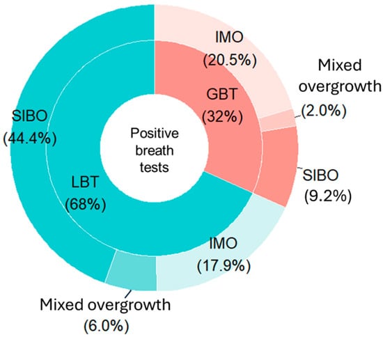 When differentiating between the two overgrowth subtypes in SIMO-positive patients, SIBO was still identified by LBT in more than twice as many cases as GBT, being the most frequently diagnosed condition in patients undergoing LBT. By contrast, IMO was the predominant diagnosis in the GBT group. Notably, despite these differences in distribution compared to the overall sample, the proportion of IMO diagnoses was relatively similar between the two tests (17.9% in LBT and 20.5% in GBT) (Figure 3).