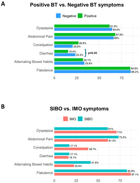 Prevalence of symptoms in small intestinal microbial overgrowth. (A) illustrates the differences in symptoms between patients with negative and positive breath tests; diarrhea was statistically higher in patients with negative breath tests than in those with positive ones (p = 0.045). (B) illustrates the differences in symptoms between patients with Small Intestinal Bacterial Overgrowth (SIBO) and those with Intestinal Methanogen Overgrowth (IMO); no single symptom reliably distinguished between SIBO and IMO. Abbreviations: BT: breath test; SIBO: Small intestinal Bacterial Overgrowth; IMO: Intestinal Methanogen Overgrowth.