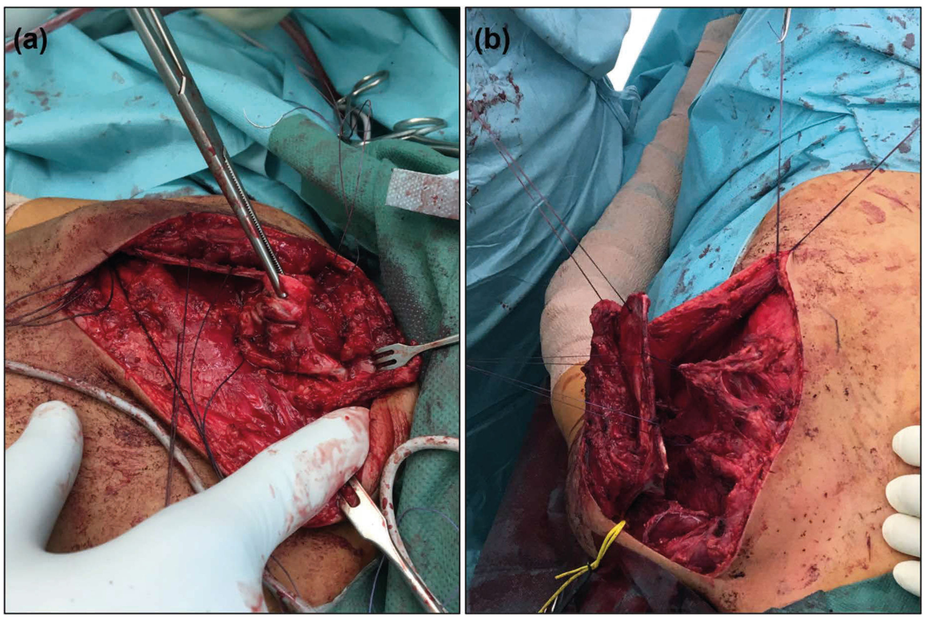 The procedure begins with the patient in the supine position, followed by a prophylactic midshaft clavicular osteotomy to facilitate repositioning of the scapula and minimize traction-related neurovascular risk during the procedure. After the osteotomy, the periosteum is closed to promote bony healing. The patient is then repositioned into prone position, and a curvilinear incision is made over the medial third of the scapula.