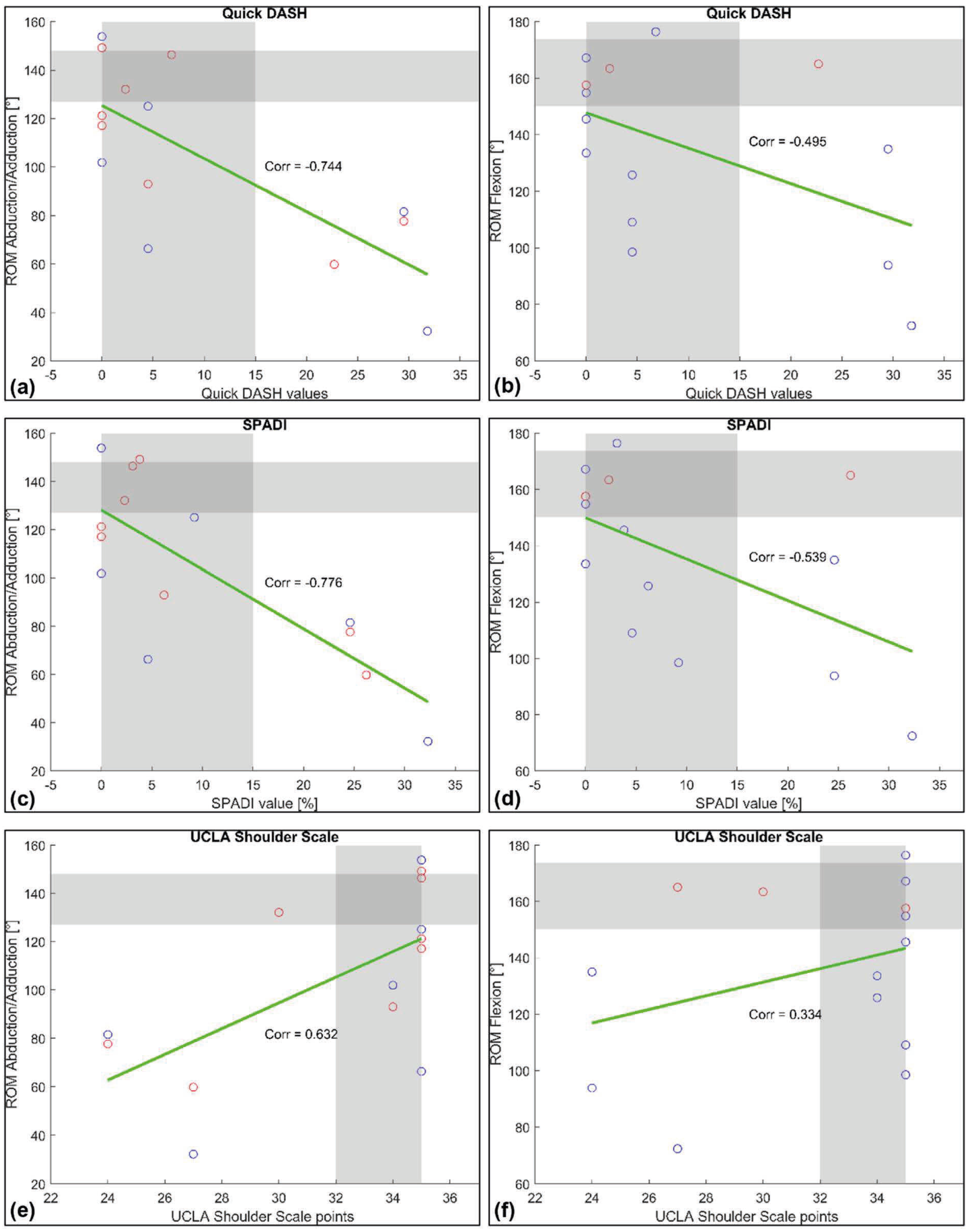Pearson’s product–moment correlation coefficient was used to explore relationships between postoperative range of motion and functional scores (Quick-DASH, SPADI, UCLA Shoulder Scale), as illustrated in