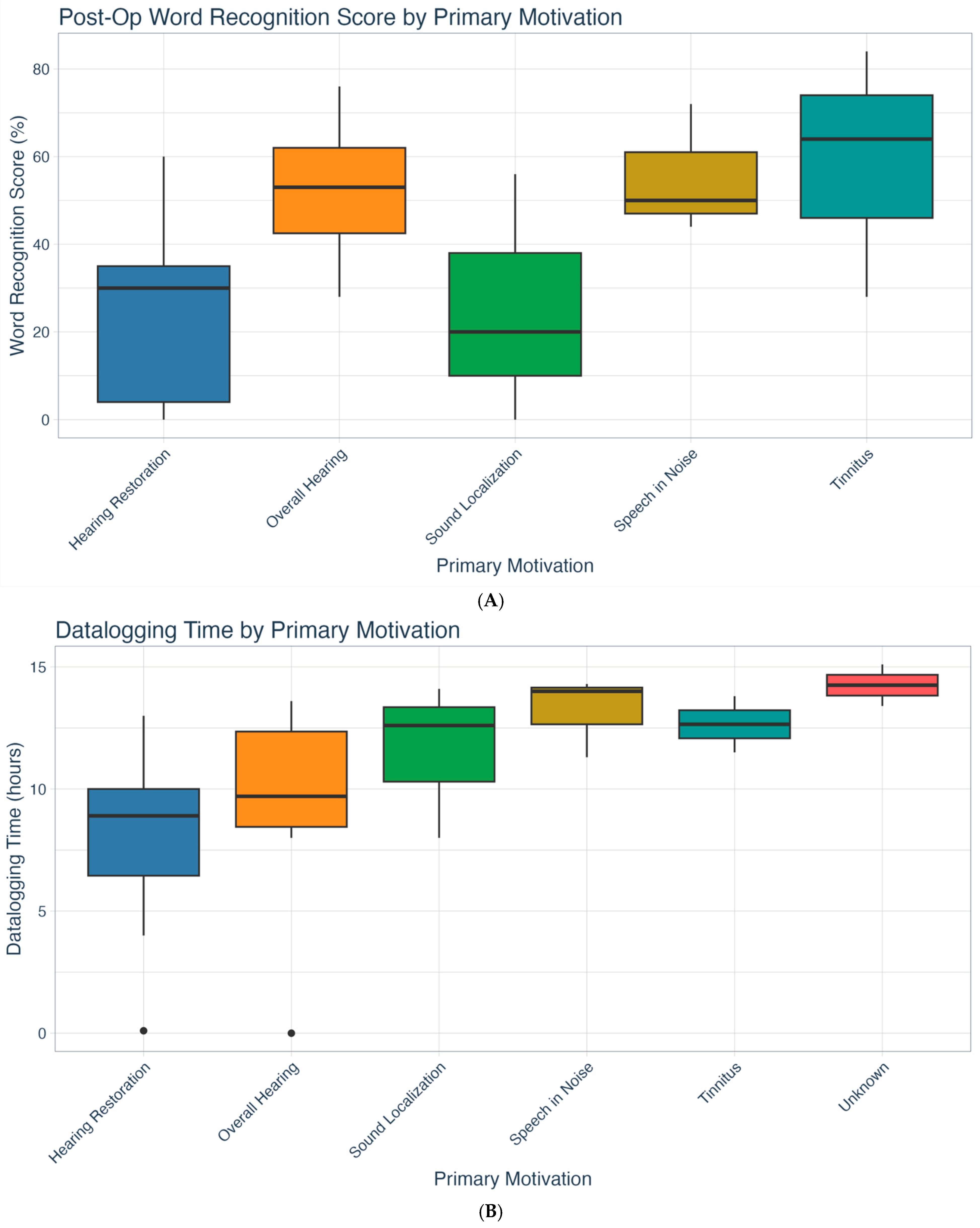 | Primary Treatment Motivation | CI Word Recognition Score | CI Datalogging Hours per Day | ||||||