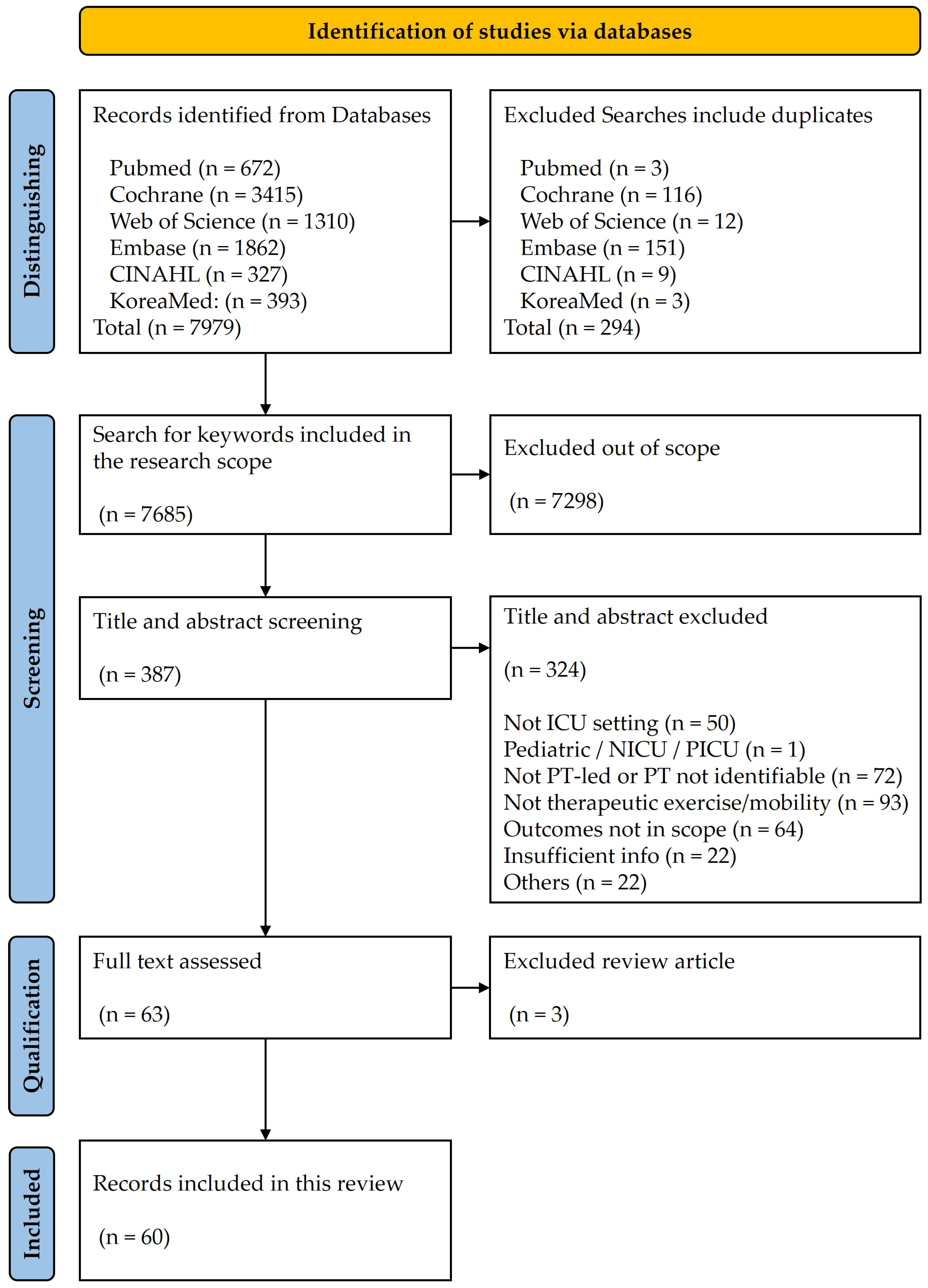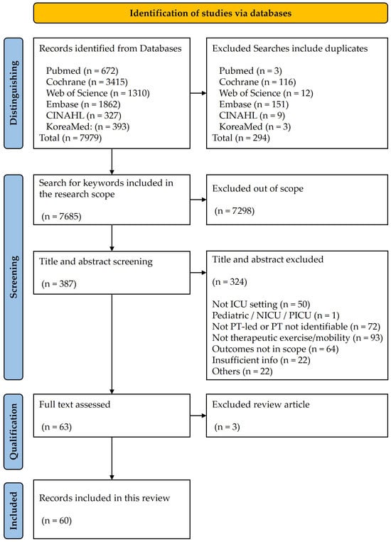 Database searches identified 7979 records across PubMed, Cochrane, Web of Science, Embase, CINAHL, and KoreaMed. After removal of 294 duplicates, 7685 records remained and were filtered to the ICU rehabilitation scope, which excluded 7298 records as out of scope and left 387 for title and abstract screening. Title and abstract screening excluded 324 records for the following reasons: not ICU setting, pediatric or neonatal ICU focus, provider not identifiable as PT-led, not therapeutic exercise or mobility, outcomes not in scope, insufficient information, and other reasons. Full texts were assessed for 64 records; 3 reviews were excluded. Finally, 60 studies met eligibility and were included in the review. The flow of records is presented in Figure 1. Given the heterogeneity of the included studies, the extracted data were synthesized into structured operational frameworks to facilitate mapping. Table 1, Table 2, Table 3, Table 4, Table 5, Table 6 and Table 7 present these synthesized findings, systematically categorizing the evidence into PT-led operational definitions, provider attribution, outcome measures with planned time points, FITT-based dosing with graded progression, safety screening including stop rules, and the minimum EMR dataset.