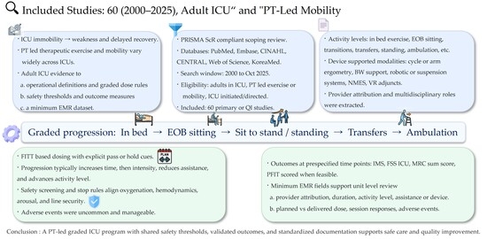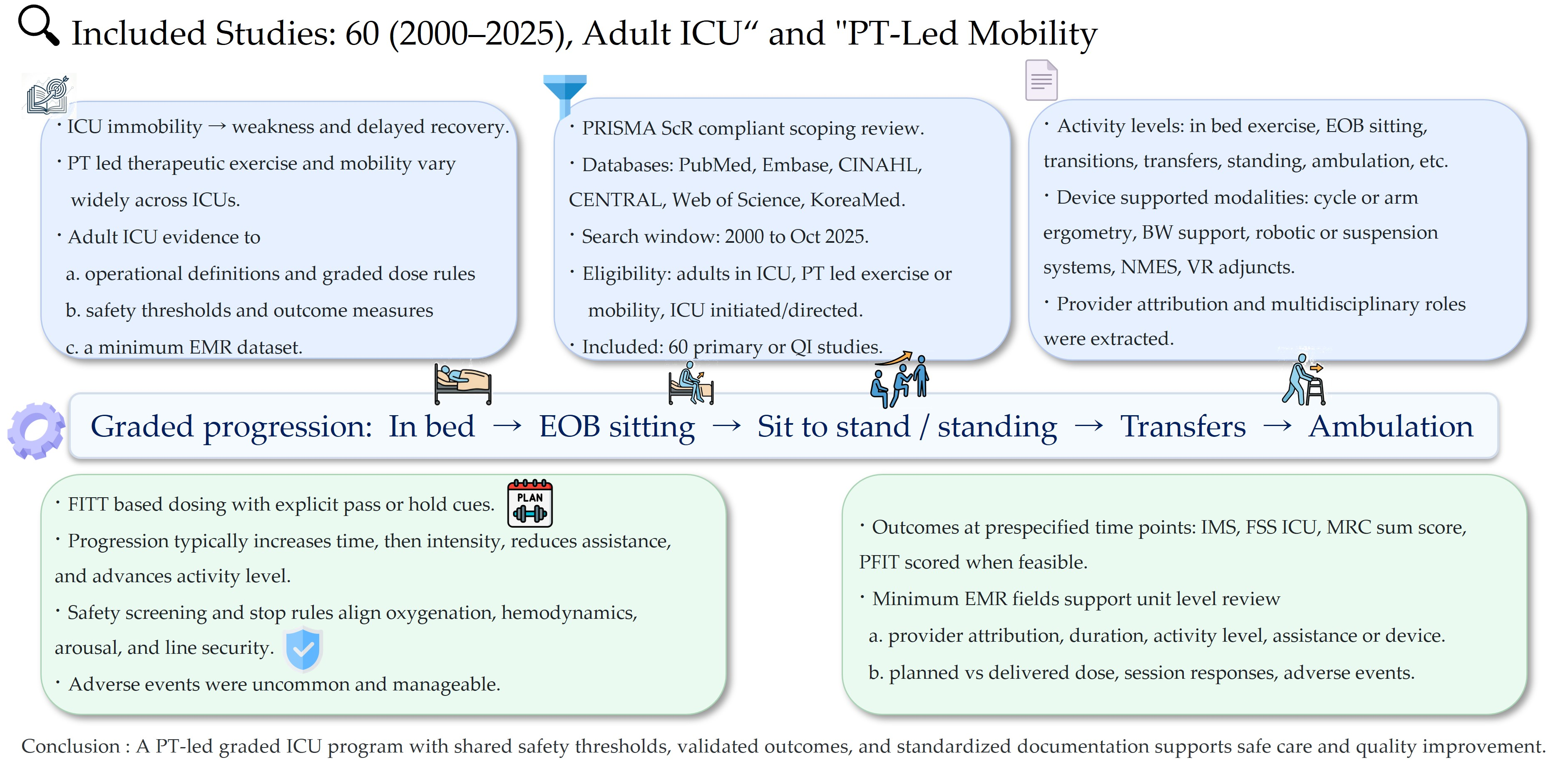 Eligible studies enrolled adults aged 18 years or older in the ICU and examined PT-led therapeutic exercise or mobility in which therapists were responsible for planning, dose prescription, progression, or delivery. Intervention content included in-bed therapeutic exercise, sitting activities, sit-to-stand, standing, ambulation in the ICU, and task-specific training. Study designs were prospective original research or prespecified quality-improvement reports, reported in English or Korean.