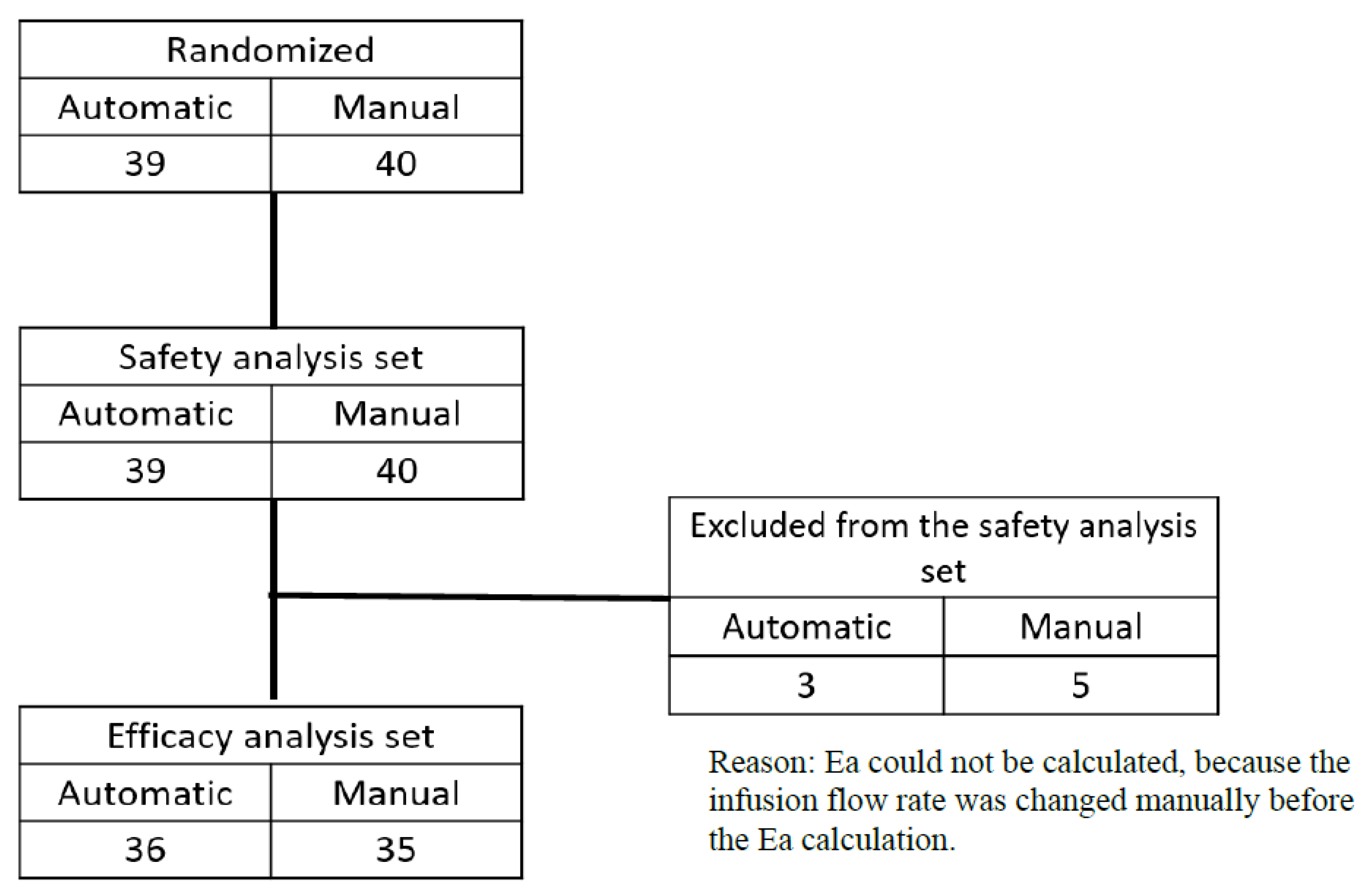 A total of 79 cases (40 in the manual group and 39 in the automatic group) were included in the safety analysis population. Of these, 8 cases (5 in the manual group and 3 in the automatic group) did not have efficacy evaluation data after randomization and were therefore excluded from the efficacy analysis population. As a result, 71 cases (35 in the manual group and 36 in the automatic group) were included in the efficacy analysis (