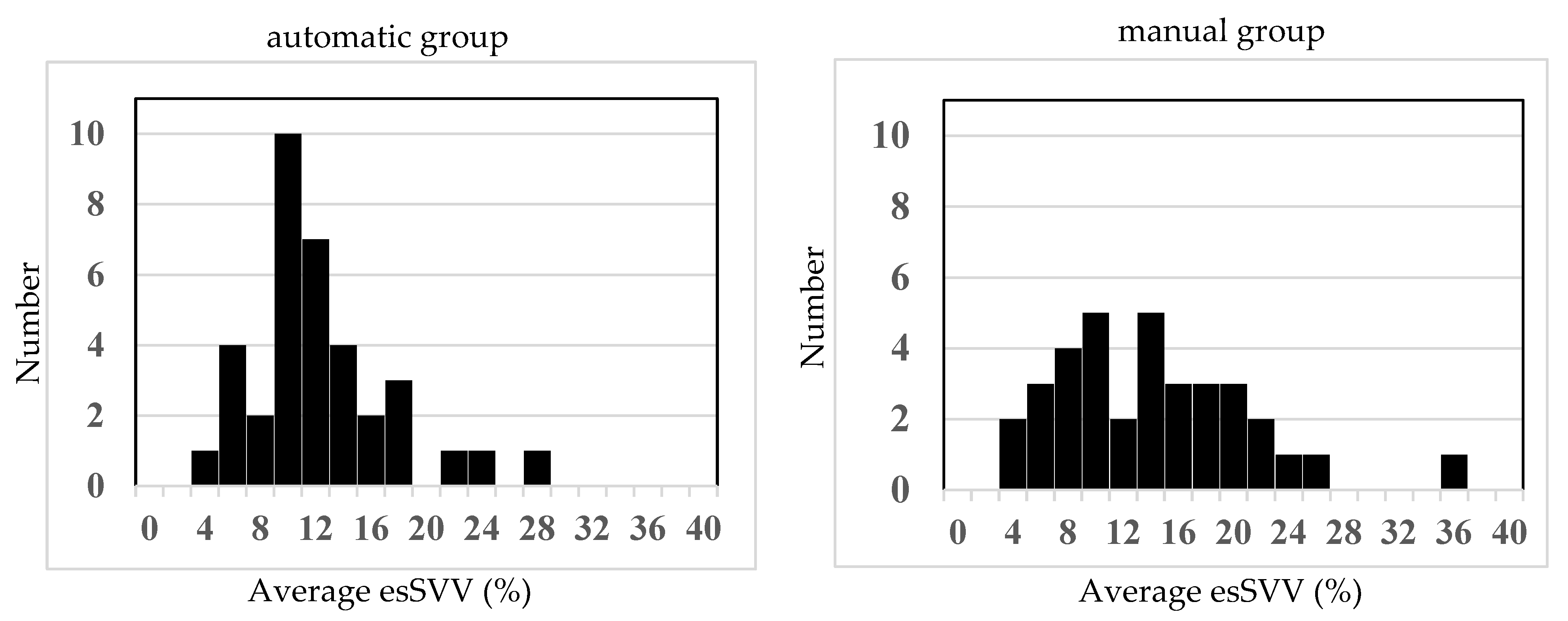 p = 0.27). The mean esSVV value during the evaluation period was 14.2 ± 6.8% in the manual group and 12.4 ± 5.1% in the automatic group, with no significant difference (