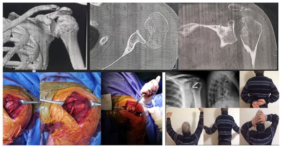 - Ippolito, G.; Zitiello, M.; De Marinis, G.; D’Angelo, F.; Surace, M.F.; Ronga, M.; Sepe, V.; Garro, L.; Faoro, L.; Ferraro, S. Posterior shoulder dislocation with engaging reverse hill-sachs lesion: A retrospective study of ten patients treated with arthroscopy or open reduction and stabilisation. J. Clin. Med. 2021, 10, 1410. [Google Scholar] [CrossRef] [PubMed]