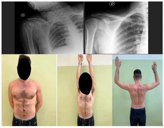Figure 3. A 54-year-old man with type 1 injury 4 weeks after trauma. X-ray and clinical check-up at 12 months. - Subscapularis Transposition (McLaughlin Technique) (Randelli Type 1): In Type 1 lesions where the impact injury was not deemed repairable due to chronicity (e.g., 6–8 weeks post-trauma), the subscapularis tendon was transposed into the defect and fixed with transosseous sutures or anchors (as illustrated in Figure 4).