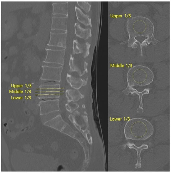HU values were measured on axial CT images at three levels (upper, middle, and lower thirds) of both the superior and inferior vertebrae body adjacent to the surgical disc space (Figure 1). Regions of interest (ROIs) were placed centrally in the trabecular bone, avoiding cortical margins and venous channels. The centre of each ROI was targeted to the central portion of the vertebral body, and the ROI area was set to include more than 50% of the vertebral body cross-sectional area while avoiding inclusion of the cortical bone.