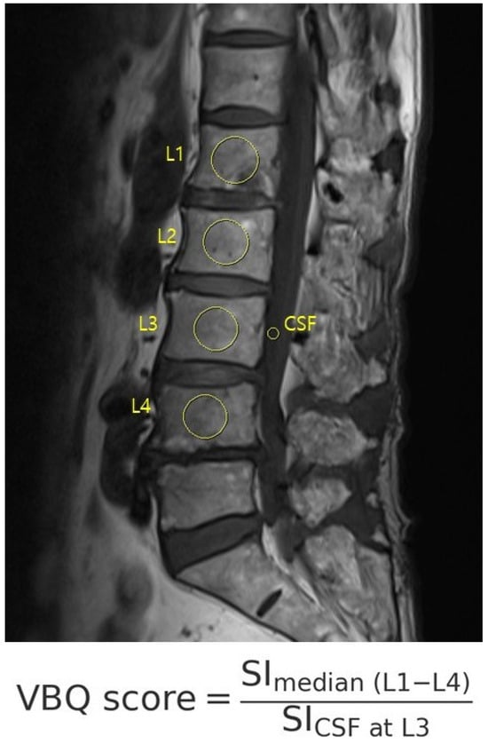The VBQ score was calculated on T1-weighted MRI as the ratio of the vertebral body to CSF signal intensity, using manually placed ROIs from L1 to L4 and CSF at L3.