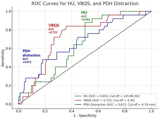 Although the ROC-derived cutoff values for HU, VBQ score, and PDH distraction were statistically significant, the corresponding AUC values indicate only moderate discriminative ability. Therefore, these thresholds should be interpreted cautiously and should not be regarded as absolute indicators for clinical decision-making. Rather, these parameters are better considered as adjunctive tools for risk stratification, to be interpreted in conjunction with other patient- and surgery-related factors, rather than as standalone diagnostic thresholds.