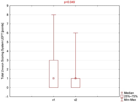Comparison of total Zinreich scores (left side) between visit 1 (v1) and visit 2 (v2).