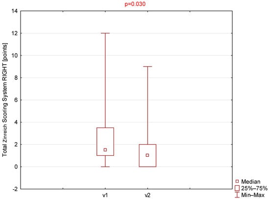 Comparison of total Zinreich scores (right side) between visit 1 (v1) and visit 2 (v2).