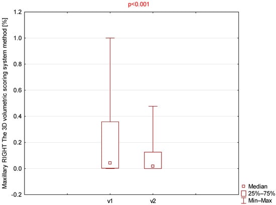 Comparison of right maxillary 3D volumetric scores between visit 1 (v1) and visit 2 (v2).