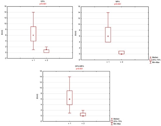 A statistically significant decrease in BVAS was observed between the two visits. The mean BVAS at the first visit was 6.9 ± 3.3 (median 6, range 1–14), whereas at the second visit it decreased to 0.5 ± 0.6 (median 0, range 0–2). A statistically significant reduction in BVAS was also noted when patients were stratified by ANCA-associated vasculitis subtype (GPA vs. MPA). In the GPA group, BVAS decreased from 6.9 ± 3.7 (median 6, range 1–14) at the first visit to 0.7 ± 0.7 (median 0, range 0–2) at the second visit. In the MPA group, BVAS decreased from 6.8 ± 3.0 (median 6, range 4–14) to 0.3 ± 0.5 (median 0, range 0–1).