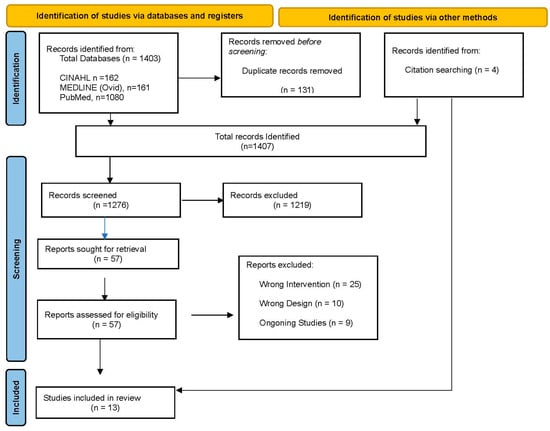 The search resulted in a total of 1407 articles, including systematic review and meta-analysis, with an additional four studies identified through reference checks. A total of 131 duplicated articles were removed, leaving 1276 articles. A total of 1219 articles were eliminated after screening of titles and abstracts. The remaining 57 articles were assessed using full text, after which 44 were excluded, with 9 articles being protocol, 10 articles using inappropriate outcome measures (e.g., postural control ability, transcutaneous electrical nerve stimulation (TENS), wearable devices mounted on a robot), and 25 articles not meeting the inclusion criteria. A total of 13 articles fulfilled the inclusion criteria and were included in this review (Figure 1: Flow diagram of selected studies).