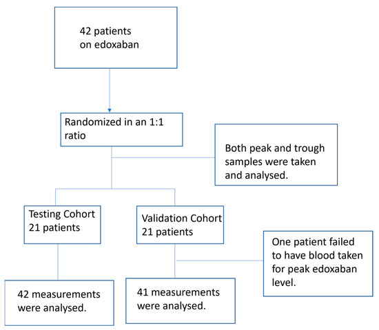 A total of 42 patients were recruited during the study period and randomly assigned to testing or validation cohorts in a 1:1 ratio (Figure 1). Baseline characteristics of both cohorts are shown in Table 1. Baseline demographics and medical comorbidities were comparable in both cohorts. The trough plasma edoxaban level and anti-Xa activity of the testing cohort were lower than those of the validation cohort.