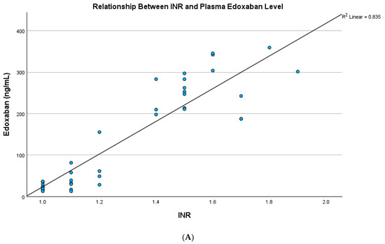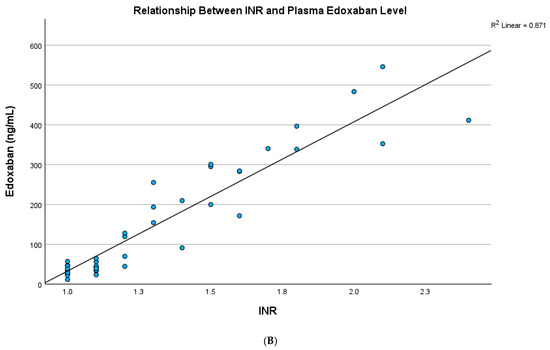 (A) The plasma edoxaban level showed a significant and strong relationship with the INR in the testing cohort (R square: 0.835, p < 0.001). (B) The plasma edoxaban level showed a significant and strong relationship with the INR in the validation cohort (R square: 0.871, p < 0.001).