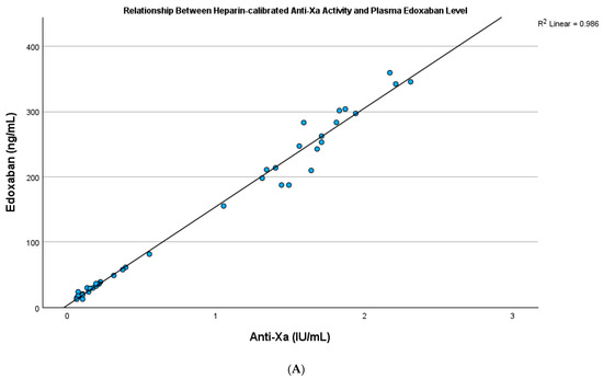 The following supporting information can be downloaded at: https://www.mdpi.com/article/10.3390/jcm14031006/s1, Figure S1A: The plasma edoxaban level and PT showed strong and significant correlation in testing cohort (R square: 0.819, p < 0.001). Figure S1B: The plasma edoxaban level and PT showed strong and significant correlation in validation cohort (R square: 0.879, p < 0.001). Figure S2A: The plasma edoxaban level showed a significant relationship with APTT in testing cohort (R square: 0.629, p < 0.001). Figure S2B: The plasma edoxaban level showed a significant relationship with APTT in validation cohort (R square: 0.517, p < 0.001). Figure S3A: The difference between predicted and measured plasma edoxaban level versus mean plasma edoxaban level in the testing cohort using the INR-derived formula are shown by Bland-Altman plot. The 95% confidence interval (CI) of limit of agreement for testing by INR-derived prediction formula was −90.23 to 87.88 ng/mL. Figure S3B: The difference between predicted and measured plasma edoxaban level versus mean plasma edoxaban level in validation cohort from INR-derived formula are shown by Bland-Altman plot. The 95% confidence interval (CI) of limit of agreement was −100.02 to 130.01 ng/mL. Figure S4A: The difference between predicted and measured plasma edoxaban level versus mean plasma edoxaban level in the testing cohort from heparin calibrated anti-Xa derived formula are shown by Bland-Altman plot. The 95% confidence interval (CI) of limit of agreement was −28.24 to 28.24 ng/mL. Figure S4B: The difference between predicted and measured plasma edoxaban level versus mean plasma edoxaban level in the validation cohort from heparin-calibrated anti-Xa derived formula are shown by Bland-Altman plot. The 95% confidence interval (CI) of limit of agreement was −26.88 to 31.94 ng/mL. Table S1: The diagnostic performance of using INR-derived formula to determine the cut-off plasma edoxaban level for intravenous thrombolytic therapy for patients present with ischaemic stroke (100 ng/mL). From the prediction formula, the INR of ≥1.2 would predict the plasma edoxaban level of 100 ng/mL. The results from (A) Testing cohort showed sensitivity and specificity of 100% and 87.0% (95% C.I.: 73.2–100%) respectively and (B) Validation cohort showed sensitivity and specificity of 100% and 86.4% (95% C.I.: 72.0–100%) respectively. Table S2: The diagnostic performance of using INR-derived formula to determine the cut-off plasma edoxaban level for managing patients with bleeding complications or prior to urgent invasive procedures (50 ng/mL). From the prediction formula, the INR of ≥1.1 would predict the plasma edoxaban level of 50 ng/mL. The results from (A) Testing cohort showed sensitivity and specificity of 100% and 65% (95% C.I.: 44.1–85.9%) respectively and (B) Validation cohort showed sensitivity and specificity of 95.8% (95% C.I: 87.8–100%) and 58.8% (95% C.I.: 35.4–82.2%) respectively. Table S3: The diagnostic performance of using heparin calibrated anti-Xa activity derived formula to determine the cut-off plasma edoxaban level for administrating intravenous thrombolysis in patients presenting with ischaemic stroke (100 ng/mL). From the prediction formula, the anti-Xa activity of ≥0.64 would predict the plasma edoxaban level of 100 ng/mL. The results from (A) Testing cohort showed 100% sensitivity and specificity and (B) Validation cohort also showed 100% sensitivity and specificity. Table S4: The diagnostic performance of using heparin calibrated anti-Xa activity derived formula to determine the cut-off plasma edoxaban level for managing patients with bleeding complication or prior invasive procedures (50 ng/mL). From the prediction formula, the anti-Xa activity of ≥0.31 would predict the plasma edoxaban level of 50 ng/mL. The results from A) Testing cohort showed 100% sensitivity and specificity and B) Validation cohort showed sensitivity and specificity of 95.8% (95% C.I.: 87.8–100%) and 93.8% (95% C.I.: 81.9–100%) respectively. Table S5: Details of clinical indications for requesting plasma edoxaban level. Table S6: The diagnostic performance of using INR-derived formula to determine the cut-off plasma edoxaban level for administrating intravenous thrombolysis in patients presenting with ischaemic stroke (100 ng/mL). The data was generated from real-life clinical requests of plasma edoxaban level. From the prediction formula, the INR value of ≥1.2 would predict the plasma edoxaban level of 100 ng/mL. The sensitivity and specificity were 100% and 38.1% (95% C.I.: 17.3–58.9%) respectively. Table S7: The diagnostic performance of using INR-derived formula to determine the cut-off plasma edoxaban level for managing patients with bleeding complications or prior to urgent invasive procedures (50 ng/mL). The data was generated from real-life clinical requests of patients. From the prediction formula, the INR of ≥1.1 would predict the plasma edoxaban level of 50 ng/mL. The sensitivity was 100%. However, the specificity was rather low (18.8%, 95% C.I: 0–37.9%).