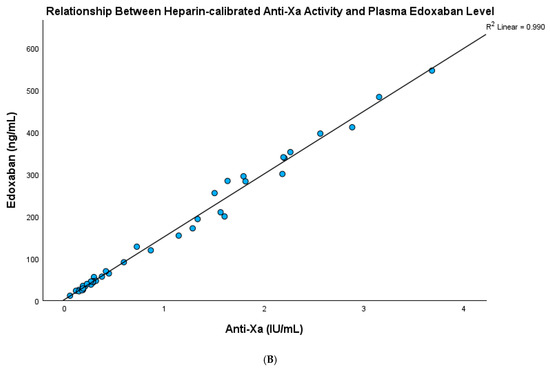 (A) The plasma edoxaban level showed a significant and strong relationship with heparin-calibrated anti-Xa activity in the testing cohort (R square: 0.986, p < 0.001). (B) The plasma edoxaban level showed a significant and strong relationship with heparin-calibrated anti-Xa activity in the validation cohort (R square: 0.990, p < 0.001).