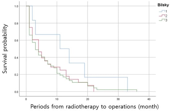 The Bilsky grade was first used by Bilsky et al. to communicate the degree of spinal cord compression []. According to Bendfeldt et al., an increased length of hospital stay, many nonhome discharges, poor surgical outcomes and low 1-year survival rates were reported in patients with a higher Bilsky grade than a low grade []. According to the neurologic, oncologic, mechanical and systemic (NOMS) criteria, surgical treatment could be considered for patients with high Bilsky grades, but prioritizing surgical treatment in patients with mild symptoms might be a burden on patients and surgeons. However, the period from radiotherapy to surgery was significantly different between grades 1 and 2, and grades 1 and 3. In particular, in the case of Bilsky grade 2 or higher, surgical treatment was performed at about 6 months, so it could be said that radiotherapy might be ineffective. Therefore, Bilsky grade 2 could be considered an important factor in determining the treatment plan. Additionally, as confirmed in the multivariate analysis, in cases with pathologic fractures or semirigid (thoracic) lesions, it would be better to consider surgical treatment primarily.