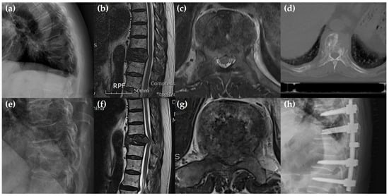 Representative case in group E of an 81-year-old male patient who underwent radiotherapy as the primary treatment for T10 metastasis underlying prostate cancer. (a–d) Pre-radiotherapy radiograph, CT and MRI revealed the T10 metastasis, Bilsky grade 2 and osteolytic lesion with pathologic fracture. (e–g) Three months post-radiotherapy, the patient experienced severe back pain and incomplete lower extremities paralysis showing Bilsky grade aggravation (2 -> 3) (h) The patient emergently underwent posterior decompression with T8-9-11-12 posterior fusion surgery.