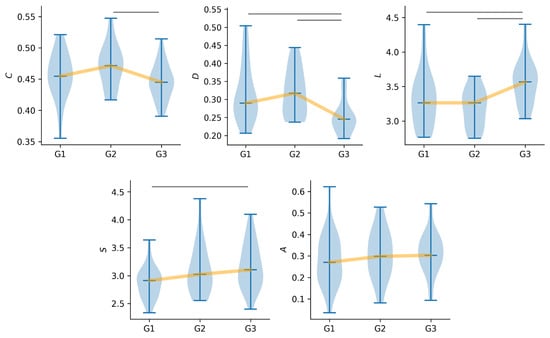Global network characteristics differ between groups. Sample distributions of average clustering coefficient C, diameter D, average shortest path length L, synchronizability S, and assortativity A. G1 = control group, G2 = PNES group, G3 = epilepsy group). Yellow lines connect median values and are for eye guidance only. Grey vertical lines indicate significant differences between groups.