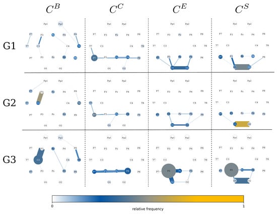 In the case of the strength-based centrality concepts (/ and ), we further observe a distinct substructure in the networks across all three groups, and while it is similar to the previously described one, it further and more dominantly spans into the occipital brain regions (vertices O1 and O2). A distinction between these substructures observed in groups G1 and G2 is only limitedly possible, yet the networks of group G3 show a very pronounced highlighting of the left-hemispheric parietal brain region (vertex P3), both in terms of the duration for which it was most important and the proportion of subjects for which this specific brain region is deemed most important. Nevertheless and specifically when considering eigenvector centrality , people with PNES are accentuated compared to people from the other groups, as the communication between left- and right-hemispheric occipital brain regions is observed in the majority of subjects with PNES.