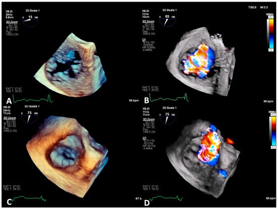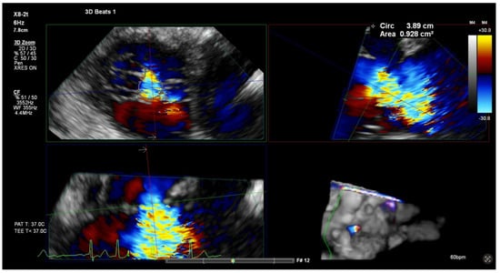 - Utsunomiya, H.; Harada, Y.; Susawa, H.; Takahari, K.; Ueda, Y.; Izumi, K.; Itakura, K.; Ikenaga, H.; Hidaka, T.; Fukuda, Y.; et al. Comprehensive Evaluation of Tricuspid Regurgitation Location and Severity Using Vena Contracta Analysis: A Color Doppler Three-Dimensional Transesophageal Echocardiographic Study. J. Am. Soc. Echocardiogr. 2019, 32, 1526–1537.e2. [Google Scholar] [CrossRef] [PubMed]