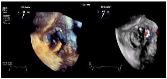 3D-zoom, en-face view of the TV, with and without color, showing a restricted septal leaflet due to CIED lead (white star), causing TR. CIED, cardiac implantable electronic device; TR, tricuspid regurgitation; TV, tricuspid valve.
