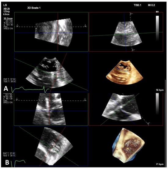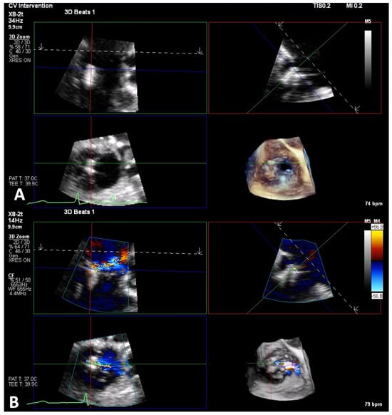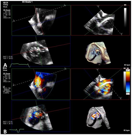 3D-zoom MPR to check adequate grasping and effective TR reduction. Panel (A): As shown in the orthogonal planes, both leaflets were grasped with good insertion. Panel (B): Despite a good grasping, TR was not sufficiently reduced. MPR, multiplanar reconstruction; TR, tricuspid regurgitation.