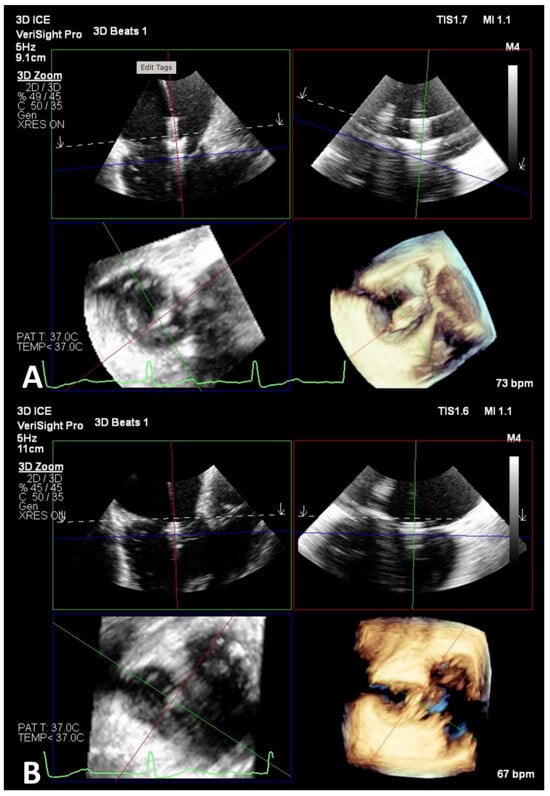 - Tang, G.H.L.; Zaid, S.; Hahn, R.T.; Aggarwal, V.; Alkhouli, M.; Aman, E.; Berti, S.; Chandrashekhar, Y.S.; Chadderdon, S.M.; D’Agostino, A.; et al. Structural Heart Imaging Using 3-Dimensional Intracardiac Echocardiography: JACC Cardiovascular Imaging Position Statement. JACC Cardiovasc. Imaging 2024, 18, 93–115. [Google Scholar] [CrossRef]
