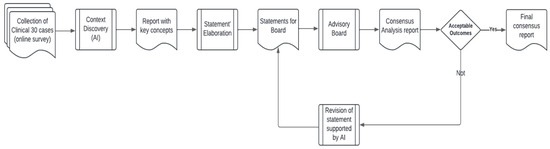 Following AI analysis, based on natural language models and prompt engineering tools, a detailed report was generated, summarizing the key concepts extracted from the data. These data were the most common key points that arose from the various open answers and observations related to the 30 cases, as analyzed by AI. Graphs, tables, and textual explanations highlighting the main findings were thus obtained, hypothetically sparing time and efforts for a manual evaluation by physicians. It served as a reference document for the subsequent stages of the process, providing a clear and concise overview of the most relevant information. Based on the generated report, detailed statements were formulated, representing preliminary interpretations and recommendations. These statements were developed to provide specific clinical guidance, based on the evidence emerging from data analysis. Each statement was structured to be clear, concise, and easily understandable by the board members.