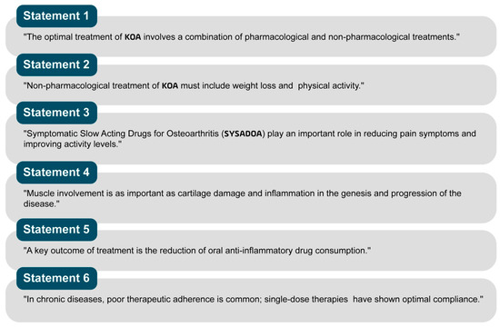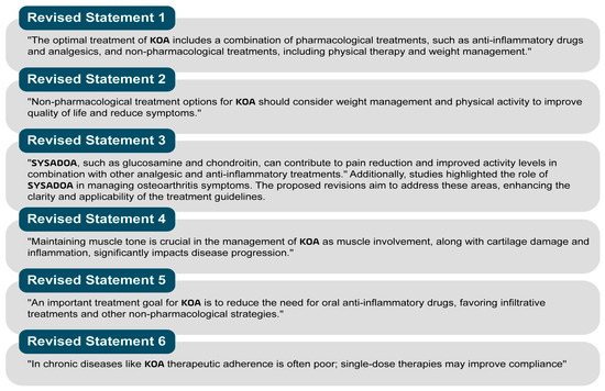 Revised Statement 1: “The optimal treatment of KOA includes a combination of pharmacological treatments, such as anti-inflammatory drugs and analgesics, and non-pharmacological treatments, including physical therapy and weight management”.