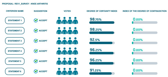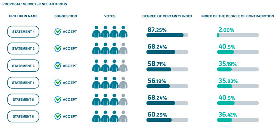 The consensus process was conducted using a software platform where participants evaluated specific treatment statements for KOA. Participants were asked to indicate their agreement or disagreement, provide a confidence rating, and supply supporting evidence. The platform calculated the degree of certainty and contradiction for each statement based on these evaluations. The statements were then analyzed, and revised versions were proposed to address the feedback and evidence collected.