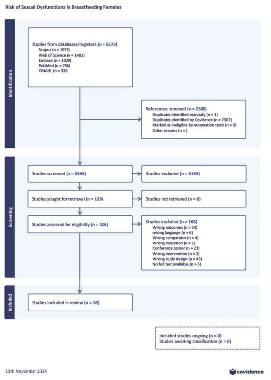 We retrieved 5573 studies from the biomedical databases. After deduplication, 3265 publications remained for the title and abstract screening. One hundred and twenty-six articles were identified for the full-text evaluation against the eligibility criteria. The final dataset included 18 publications. The findings from eight studies were incorporated into the meta-analysis. The remaining publications contributed to the qualitative analysis of postpartum sexual health.