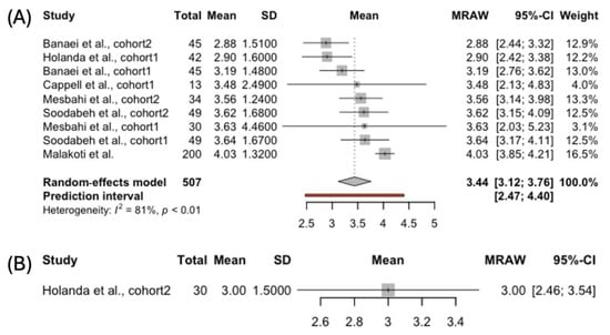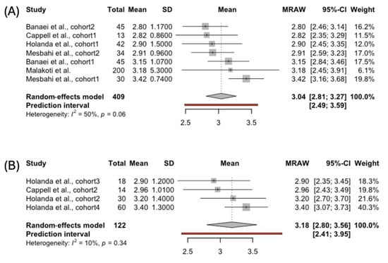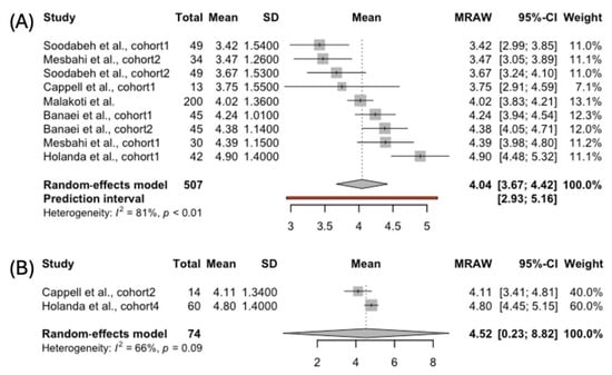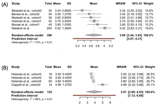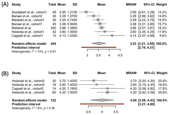 Forest plot presenting pooled score in the FSFI Satisfaction domain in women choosing (A) exclusive [,,,,,] and (B) complemented breastfeeding [,].