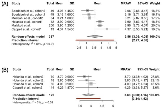 Forest plot presenting pooled score in the FSFI Pain domain in women choosing (A) exclusive [,,,,,] and (B) complemented breastfeeding [].