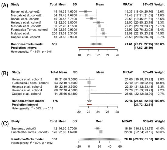 Forest plot presenting pooled score in the total FSFI score in women choosing (A) exclusive [,,,,,], (B) complemented breastfeeding [,,], and (C) formula [,].