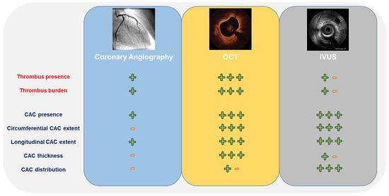 Conversely, intravascular imaging techniques such as IVUS and OCT enhance the differentiation of CAC from thrombi, allowing thorough planning and optimization of PCI procedures. Figure 1 shows the relative accuracy of angiography, IVUS, and OCT in the comprehensive assessment of CAC and its distinction from thrombi.